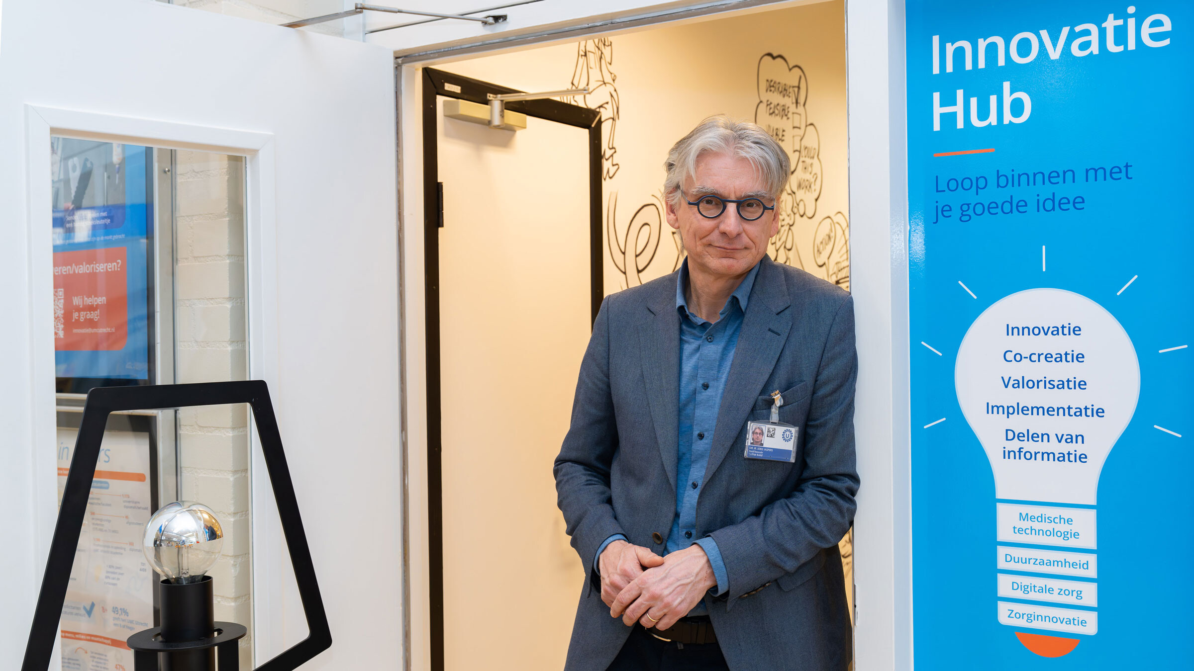 ‘We hebben in Utrecht geen algemeen hoofd Innovatie. Ik ben officieel van de Medische Technologie, al bemoei ik me ook wel ziekenhuisbreed met verbeteringen. Zo heb ik het initiatief genomen bij de oprichting van de Innovatie Hub, hier in de centrale hal. Het is een verzamelplek waar ook het verpleegkundig Innovatielab in terechtkan. Net als het Team Duurzaamheid, de collega’s van Digital Health en andere innovatiespecialisten.