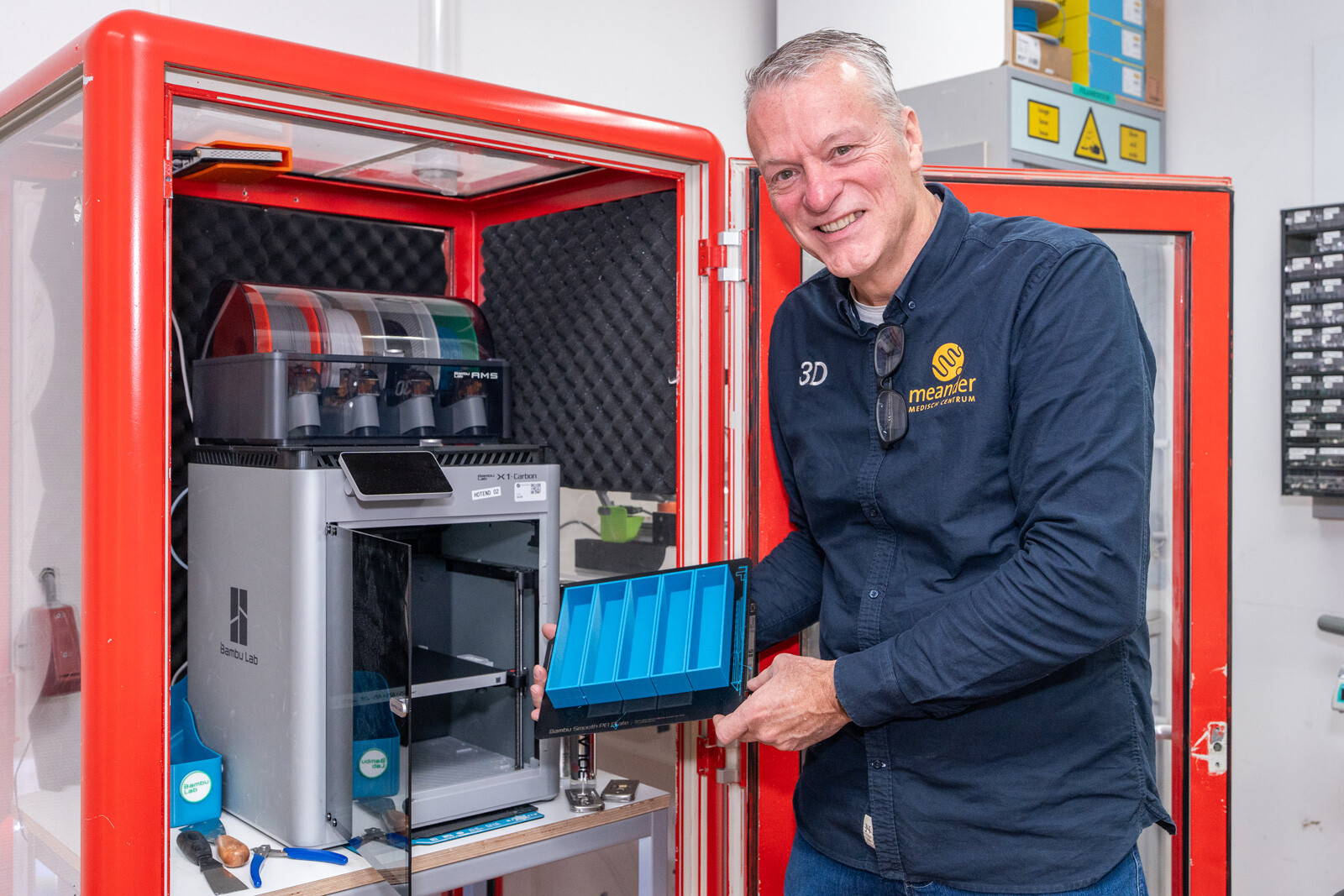 ‘Ik werk 32 jaar bij Meander en ik ben eigenlijk altijd al bezig geweest om oplossingen te verzinnen voor problemen op de afdeling. Jaren geleden werkte ik met rvs en andere materialen, maar als ik kunststof nodig had, liep ik een beetje vast. Het bestaande materiaal voorzag niet altijd in wat ik voor ogen had. Toen ben ik thuis een beetje gaan experimenteren met 3D-printen.